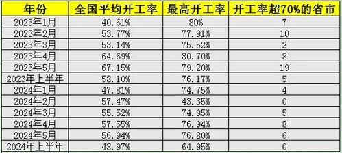 从最重要的下游开工率看,2024年以来,前六个月的全国开工率均不足60%,月均开工率仅有48.97%,开工率超70%的省市仅为个位数,明显不及去年同期,开工端未有明显改善迹象。