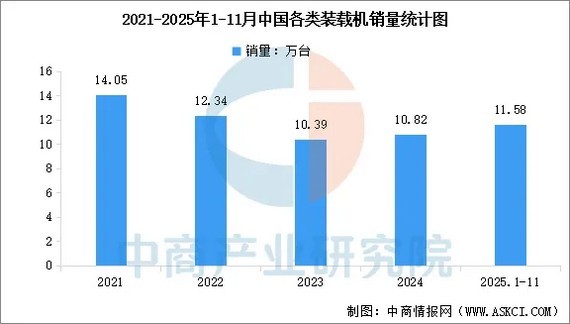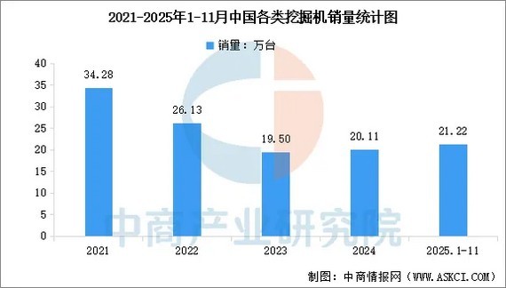 中商产业研究院发布的《2025-2030年全球及中国工程机械市场需求预测及发展趋势前瞻报告》显示,2025年1-11月,中国共销售挖掘机21.22万台,同比增长16.7%,共销售各类装载机11.58万台,同比增长17.2%。