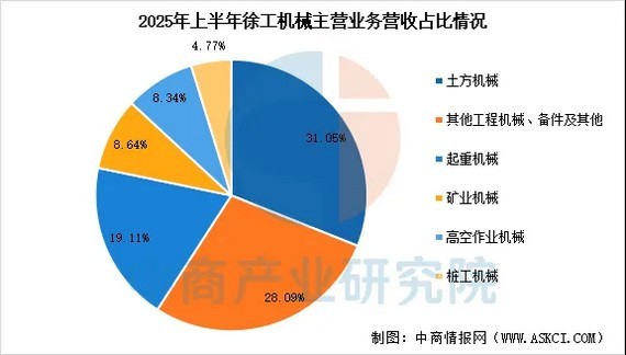 2025年前三季度,徐工机械实现营业总收入781.57亿元,同比增长11.61%,归母净利润59.77亿元,同比增长11.67%。上半年,公司土方机械收入170.2亿元,占比31.05%,起重机械收入104.7亿元,占比19.11%,矿业机械收入47.33亿元,占比8.64%,高空作业机械收入45.72亿元,占比8.34%,桩工机械收入26.15亿元,占比4.77%。