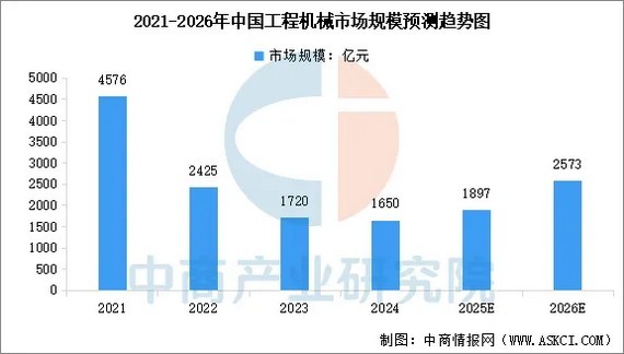 2024年下半年以来,中国工程机械市场稳定回暖,挖掘机、起重机械等设备销量环比增长,行业将进入新一轮增长周期。中商产业研究院发布的《2025-2030年全球及中国工程机械市场需求预测及发展趋势前瞻报告》显示,2024年中国工程机械市场规模为1650亿元。中商产业研究院分析师预测,2025年中国工程机械市场规模将达到1897亿元,2026年市场规模将达到2573亿元。