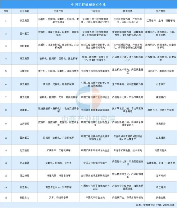 中国工程机械行业近年来快速发展,涌现出一批具有全球竞争力的企业,如徐工集团、三一重工、中联重科等。这些企业在技术研发、产品创新和市场拓展方面取得了显着成就,主要竞争优势包括技术研发、成本控制、市场覆盖及国际化布局。生产基地多集中在江苏、湖南、山东、福建等制造业发达地区,部分企业已在海外设立生产基地以拓展国际市场。